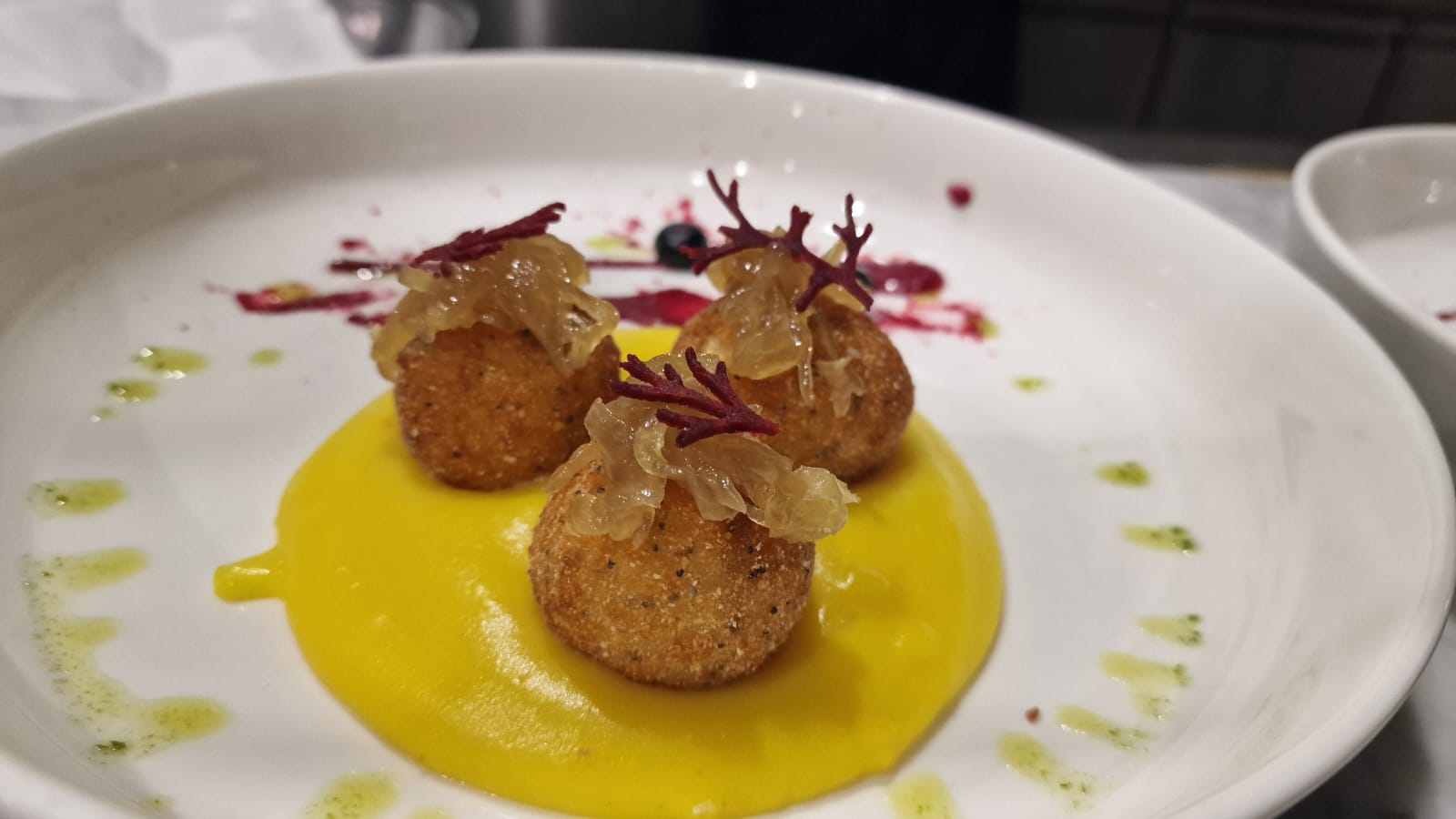 polpettina di salmone con cipolla caramellata e crema di patate al rosmarino