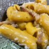 Panciotto scamorza e melanzana in salsa di datterino giallo e speck croccate